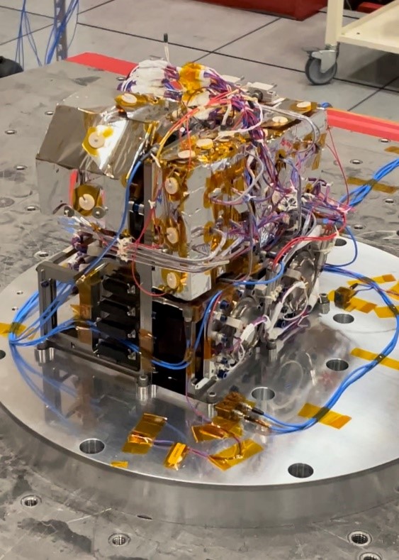 En collaboration avec les équipes du LATMOS, un premier modèle d’ingénierie a été fabriqué et « qualifié en environnement mécanique » (figure 2) avec succès. De quoi s’agit-il ? Les tests en environnement mécanique simulent, entre autres, les phases de décollage ainsi que les chocs induits par la séparation du module de descente et la coiffe du lanceur.