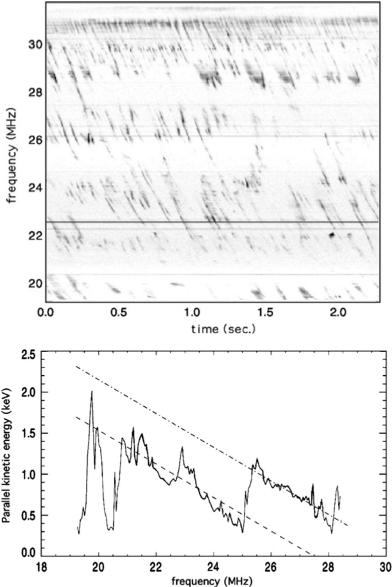 (Bas) L’analyse de sursauts individuels ou de groupes de sursauts permet de remonter à l’énergie parallèle des électrons le long du tube de flux d’Io. Les lignes pointillées représentent des variations adiabatiques, séparées à l’altitude où fce 25 MHz par un saut de potentiel (zone d’accélération parallèle) de 1 kV.