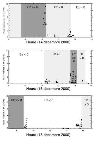 Evolution de la puissance rayonnée en UV par le cornet polaire nord de Jupiter, déduite d’images prises avec le télescope spatial Hubble avec sur une période de 6 jours. La pression dynamique du vent solaire et l’orientation du champ magnétique interplanétaire, IMF, ont été mesurés simultanément par Cassini en amont de la magnétosphère jovienne. La tendance générale des pics d’émission explosifs du cornet polaire est à la décroissance , alors que l’on se trouve en phase de recouvrement d’un sous-orage magnétique (déclenché par le passage d’un choc interplanétaire). La présence de ces pics d’émission coîncide avec la présence d’une composante sud-nord du champ magnétique interplanétaire (Bz >0) qui favorise les processus de reconnection magnétique au nez de la magnétosphère.