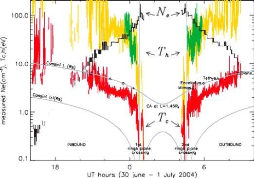 Températures (en rouge pour le coeur, jaune et verte pour le halo) et densité (noir) des électrons dans la magnétosphère de Saturne, lors de l’insertion de Cassini dans le système de Saturne en 2004.