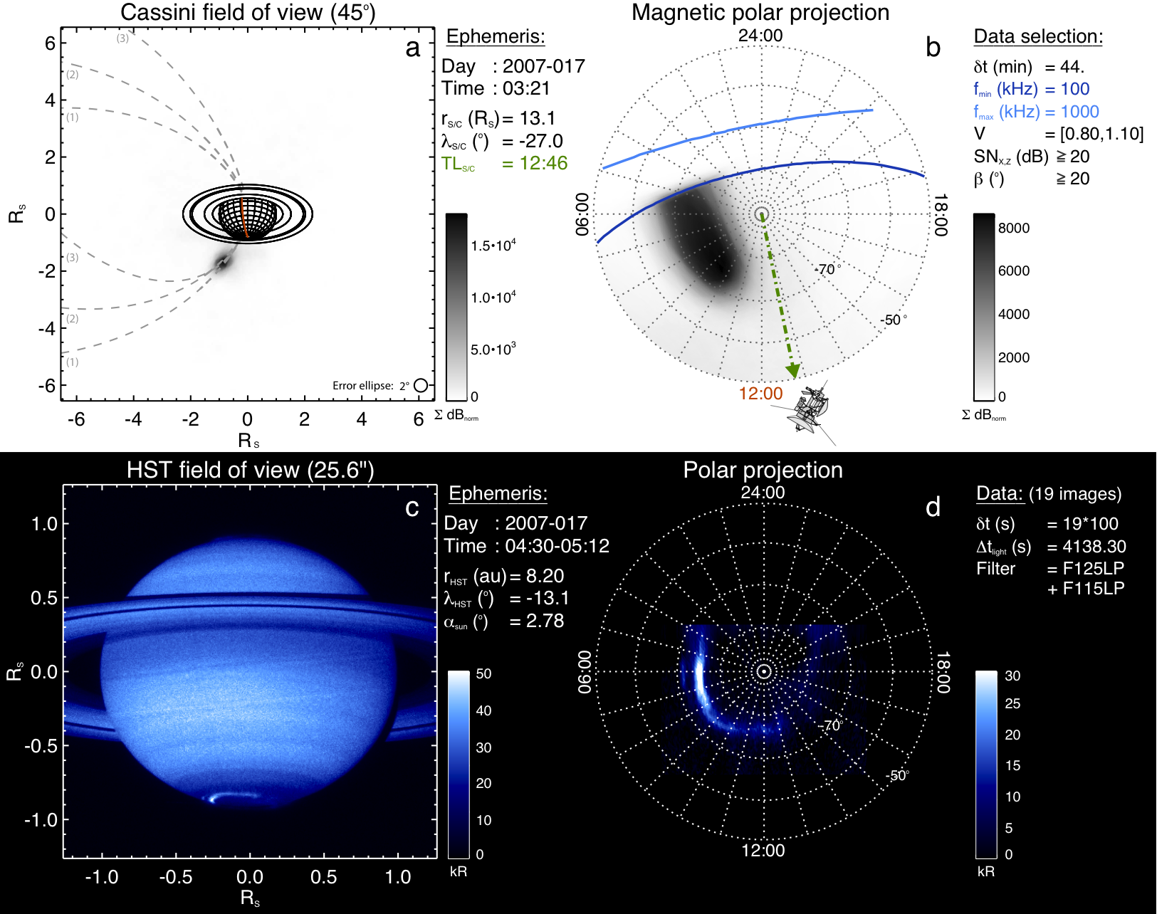 Images radio et UV du 17/01/2007 observées par Cassini et le télescope Hubble respectivement. A gauche : plan d’observation de chacun des satellites. A droite : projection polaire de l’émission organisée en temps local (la direction midi, est vers le bas). Dans le cas de l’émission radio, loin de la planète, on suit la ligne de champ magnétique jusqu’à la surface de Saturne. Les lignes bleues indiquent les horizons radio correspondant aux fréquences limites de la gamme sélectionnées, soit 100kHz et 1000kHz [Lamy 2008]. Cette figure illustre que les sources radio et UV sont portées par les mêmes lignes de champ magnétique malgré l’anisotropie de l’émission radio (seules les sources dont le diagramme d’émission englobe Cassini seront vues).