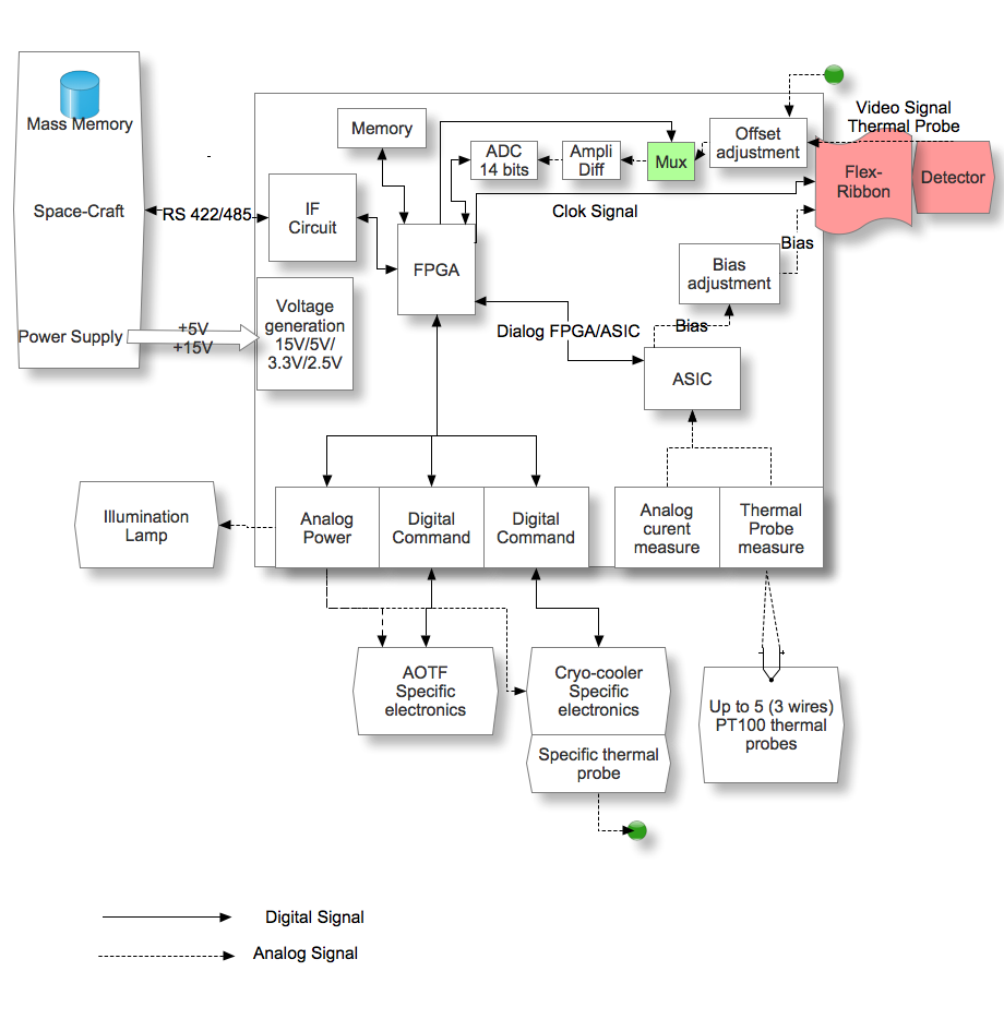 L’électronique de proximité, comme celle développée pour MicrOmega-Exomars, comprend un ASIC, où est encapsulée toute l’électronique analogique de front, un FPGA, où est encapsulée l’électronique numérique assurant le contrôle de l’instrument, et un convertisseur analogique-numérique (ADC). La réalisation a été confiée à un sous-traitant (EREMS) qui a repris l’architecture proposée et une partie de la schématique mais avec un autre composant (ADC).