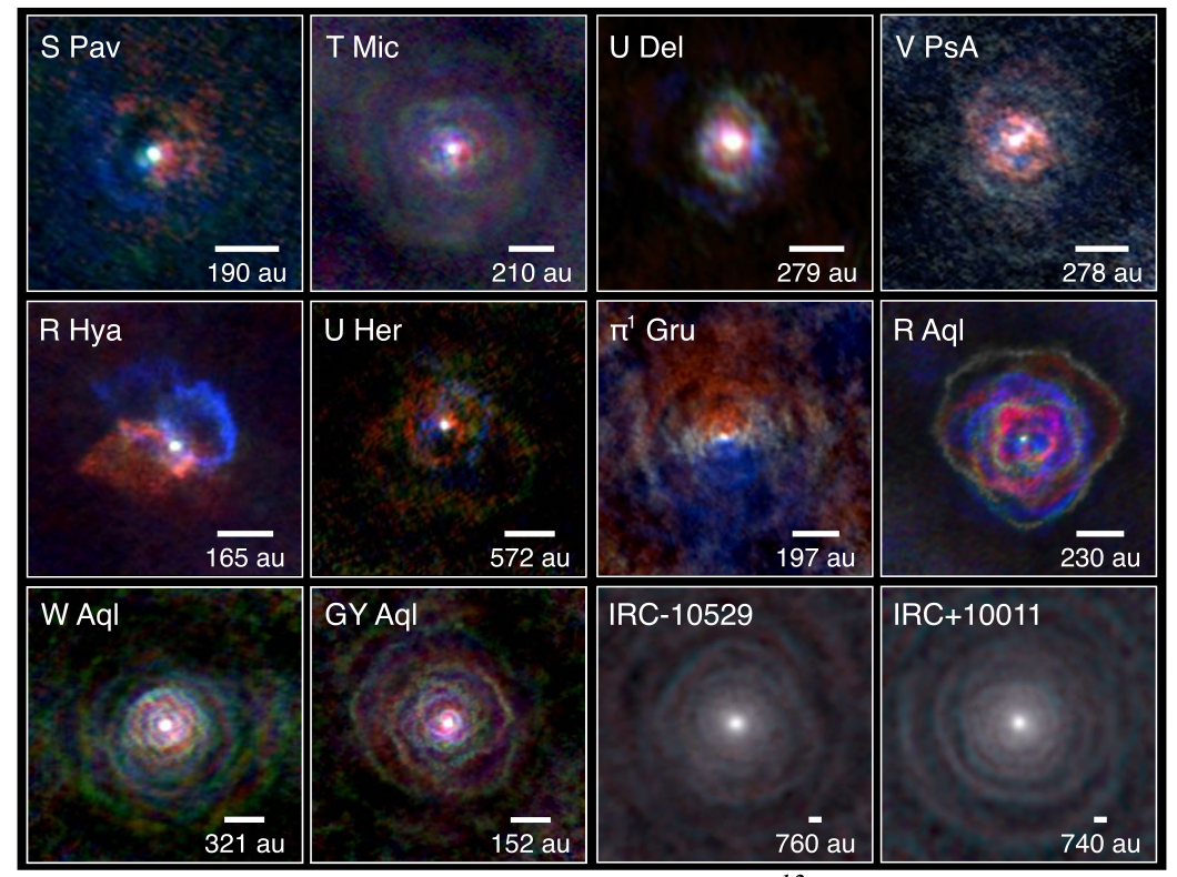 Figure de l’article paru dans Science en 2020. On voit 12 des 17 étoiles du large programme ATOMIUM dans la raie d’émission du monoxyde de carbone. La couleur code le mouvement par effet Doppler (en rouge le gaz s’éloigne, en bleu il vient dans notre direction).