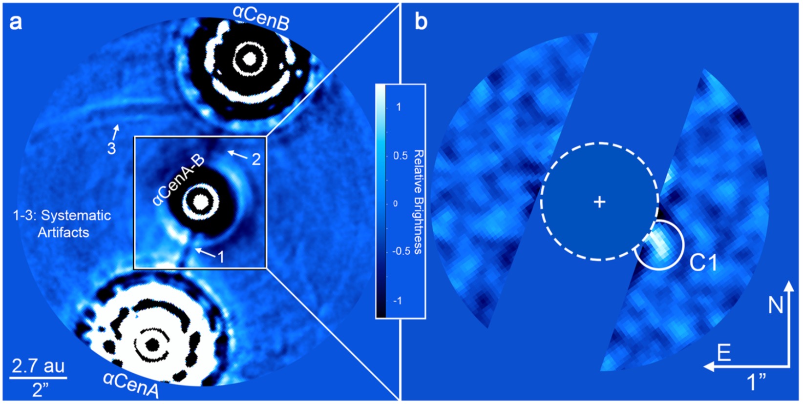 Des images ont été cumulées sur un total de 100 heures de pose entre mai et juin 2019. Grâce à une phase de traitement avancé des données, consistant à soustraire les résidus de lumière stellaire, ainsi que différents artefacts instrumentaux, les chercheurs ont mis en évidence une source (notée C1 dans l’image) qui pourrait correspondre à une planète de la taille de Neptune à Saturne.