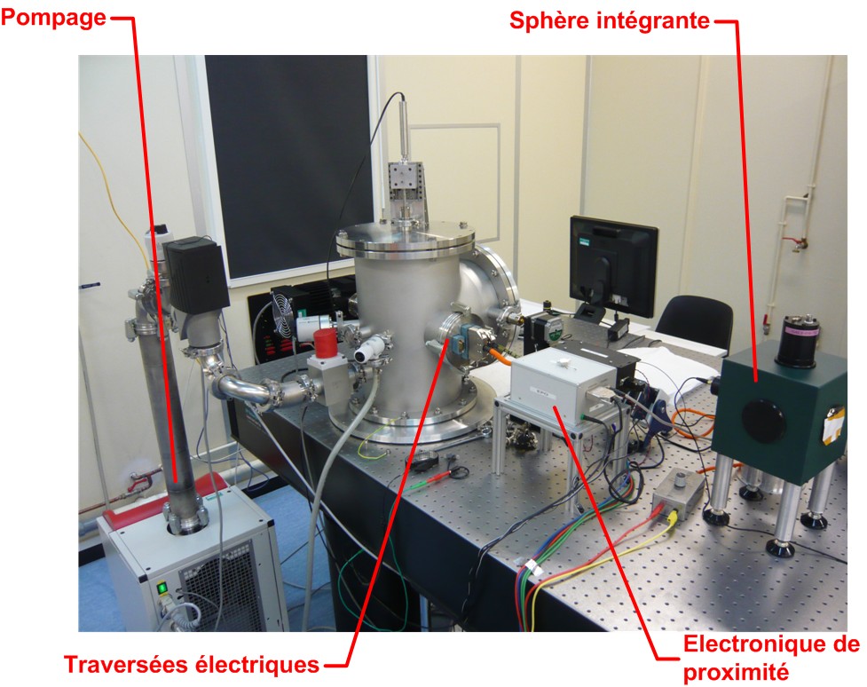 - An optical bench (1200x2400 mm2) carrying optical stimuli (integrating sphere, monochromator, halogen source…).