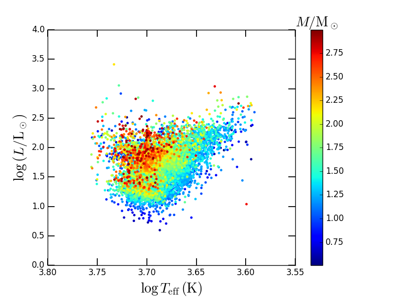 Combinés avec des mesures de température effective, et en utilisant les lois d’échelles sismiques, ces indices ont permis de déterminer la masse, le rayon et gravité de surface (log g) pour environ 13 000 géantes rouges observées par la mission spatiale Kepler. Ces mesures permettent de caractériser des échantillons importants d’étoiles, comme illustré dans la figure ci-dessous où les déterminations de rayon et de masse sont utilisées conjointement aux températures effectives pour représenter ces objets dans un diagramme de Hertzsprung-Russel enrichi de l’information en masse.