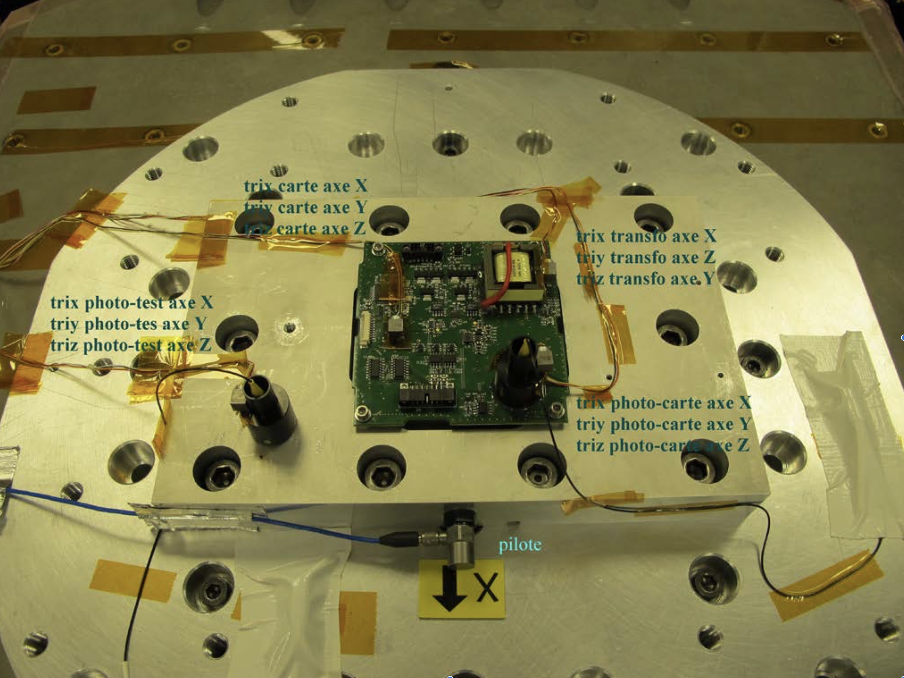 Après la campagne de tests en vibrations rĂ©alisĂ©e en dĂ©cembre 2015 Ă la PIT, oĂą nous avions dĂ©tecter une dĂ©faillance de la platine piezo-Ă©lectrique PI. Le choix de la platine s’est donc portĂ© sur une technologie qualifiĂ©e dĂ©veloppĂ©e par Cedrat. Une deuxième sĂ©rie d’essais a Ă©tĂ© faite dĂ©but avril pour vĂ©rifier le bon fonctionnement de l’Ă©lectronique de commande et de la photodiode. Les Ă©lĂ©ments ont subis jusqu’Ă 8g en frĂ©quence alĂ©atoire, et 13g en sinus dont voici l’essai sur l’axe X :