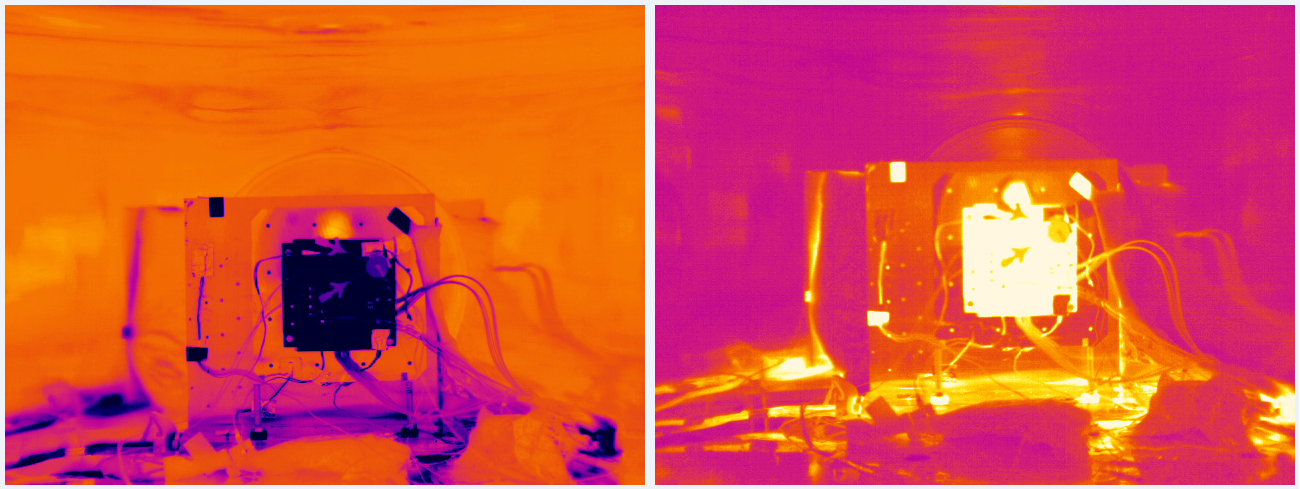 Electronique et photodiode installĂ©es dans la cuve SimEnOm lors du palier Ă -20°C (gauche) et +30°C (droite)