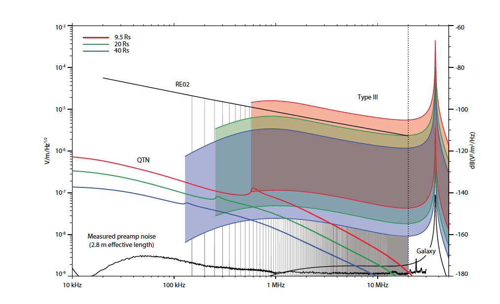En outre, les deux voies sur RFS permettront également de cross-corréler les signaux des deux dipôles orthogonaux et de localiser les sources d’émissions (goniopolarimétrie ou "direction finding"). Une des voies peut également traiter un signal en provenance du capteur magnétique (Search Coil fourni par le LPC2E) et le corréler avec un signal électrique. Ces mesures de radioastronomie sont en partie résumées par la figure ci-dessous qui donne l’ordre de grandeur (en V/m/√Hz) du champ électrique pour les grands types d’émissions/ondes attendues.