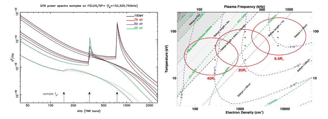 En ajustant les spectres calculés aux spectres mesurés, on peut ainsi déterminer les densités et températures des électrons du plasma ambiant (ou d’autres moments de la fonction de distribution le cas échéant), avec des précisions inégalées. En effet, les précisions attendues avec le design actuel (antennes fils minces de 2x2.m, avec une séparation des brins d’environ 3m) sont <2% sur les densités et <10% sur les températures dans 100% des cas rencontrés aux périhélies (9.5R⊙), et environ 80% des cas à 30 R⊙ (à plus grande distance, on devra souvent se contenter de la seule estimation de la densité).
