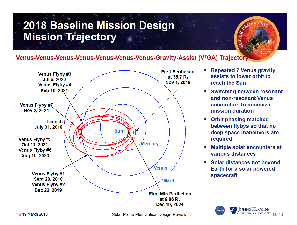 En outre, ces deux missions utilisent un scénario orbital similaire : survols de Vénus pour décroitre le périhélie (ou assistance gravitationnelle), jusqu’à ≈0.3 UA pour Solar Orbiter et jusqu’à 9.5 R⊙≈0.045 UA pour PSP. PSP a décollé de Cap Canaveral le 12 août 2018 et le lancement de Solar Orbiter est prévu en février 2020. Notons que le scénario de mission de PSP ci-dessus est pratiquement maintenu, avec quelques jours de décalage pour les évènements indiqués : par exemple, le premier périhélie de PSP a eu lieu le 5 novembre 2018, et comme prévu à 35.7R⊙ ou 0.17 UA, c’est-à -dire déjà presque deux fois plus proche du Soleil que la planète Mercure à son périhélie.