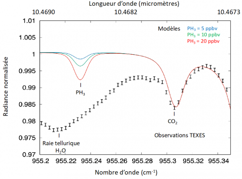 Les chercheurs ont observé une longueur d’onde (10,47 microns) correspondant à une transition vibrationnelle de PH3 bien isolée d’autres bandes possibles, mais n’ont pas trouvé de trace de la raie en question. Ils en ont déduit une limite supérieure de 5 ppbv (partie par milliard en volume) pour la pression partielle de PH3 au niveau du sommet des nuages.