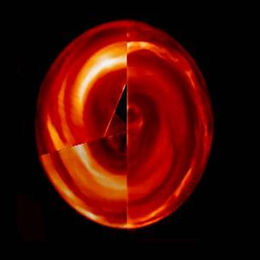 Les planètes géantes sont des planètes à rotation rapide, où la force de Coriolis est donc forte. C’est cette force de Coriolis qui induit l’existence de multiples anti-cyclones et dépressions dans les atmosphères des planètes géantes, telle la célèbre tache rouge de Jupiter. Au LESIA, en ce moment nous étudions principalement l’atmosphère de la planète Saturne grâce à la mission Cassini/Huygens et aux instruments CIRS et VIMS. L’atmosphère des planètes géantes, riches en H2 et CH4, est le siège d’une photochimie, initiée par le rayonnement ultraviolet solaire, qui produit des hydrocarbures lourds, éthane (C2H6), acétylène (C2H2),…, jusqu’au benzène (C6H6) . Avec CIRS nous mesurons la température et la composition chimique de l’atmosphère de Saturne, et nous cherchons à comprendre comment sont couplées photochimie et circulation atmosphérique. En particulier, nous mettons en évidence que l’éthane, un gaz très stable, est homogène sur toute la planète ce qui montre qu’il existe des mécanismes qui transportent les gaz sur l’ensemble de la planète.