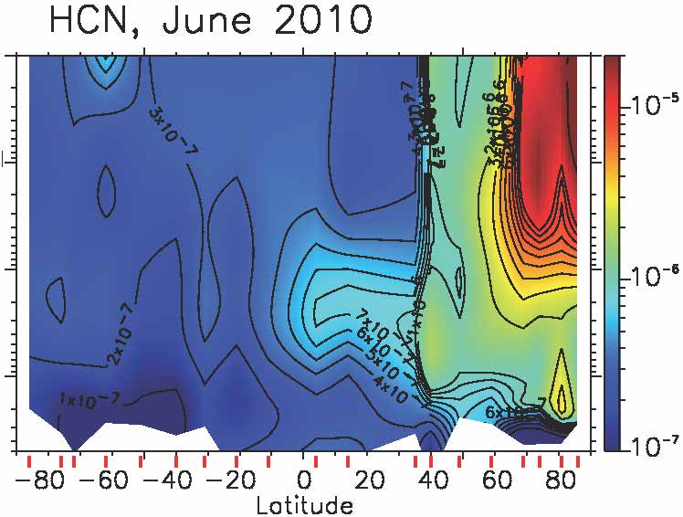 Cette carte montre la température dans l’atmosphère de Saturne en fonction de la latitude et de la pression. On voit que l’hémisphère nord, en hiver, est plus froid que l’hémisphère sud en été. Centré sur l’équateur, une oscillation de température montre que des ondes de gravité se propagent verticalement.