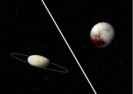 Vue d’artiste de l’anneau découvert autour de Hauméa et image en fausse couleur de Pluton