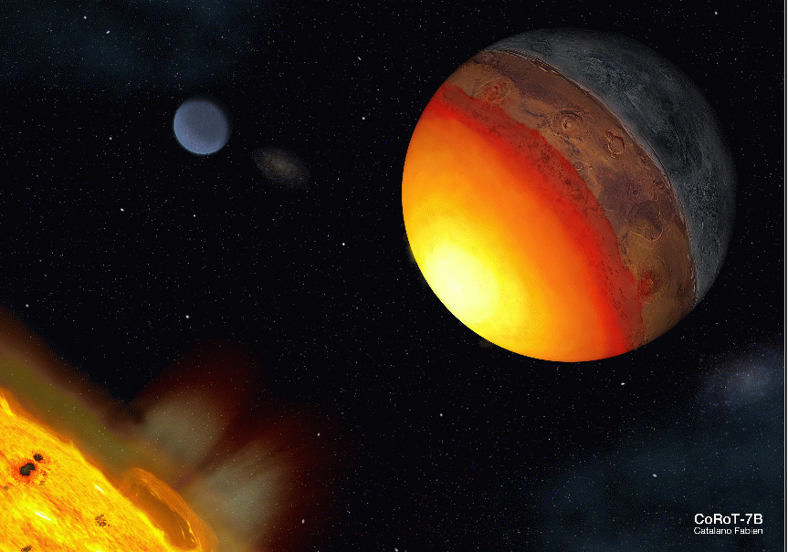 Le vent stellaire est discernable à la surface de l’étoile active au premier plan. La planète CoRoT-7c peut être vue au loin. La planète CoRoT-7b est représentée de façon réaliste. Noter l’océan de lave liquide et la partie continentale de la face éclairée. L’hémisphère non éclairé, est recouvert probablement de dépôts de glace d’eau et de dioxyde de carbone. Des volcans et des cratères d’impact peuvent être remarqués sur la partie continentale. Crédit : CNRS/F. Catalano.