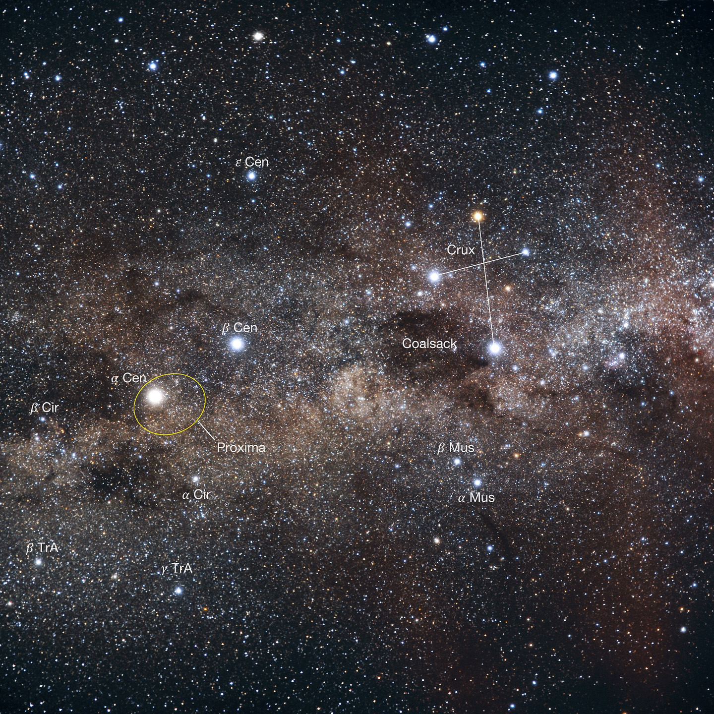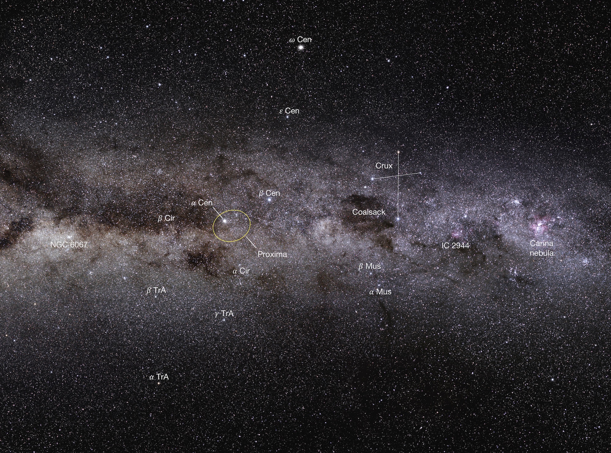 L’orbite de Proxima autour d’Alpha Centauri (ellipse jaune) représentée avec les étoiles principales des constellations voisines et la Croix du Sud (Crux) Crédits : P. Kervella (CNRS/U. de Chile/Observatoire de Paris/LESIA), ESO/S. Brunier