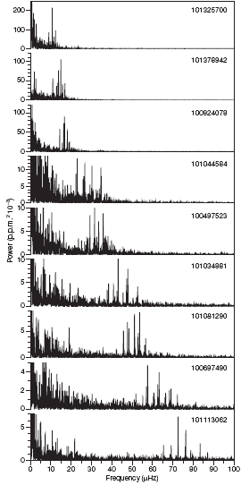 La détection des oscillations de type solaire dans les géantes rouges, montrant des modes quasi régulièrement espacés dans un domaine de fréquence caractéristique de la taille de l’objet (nu_max). Les spectres de Fourier sont ici classés par nu_max croissant.© De Ridder et al. Nature, 459, p.398 (2009).