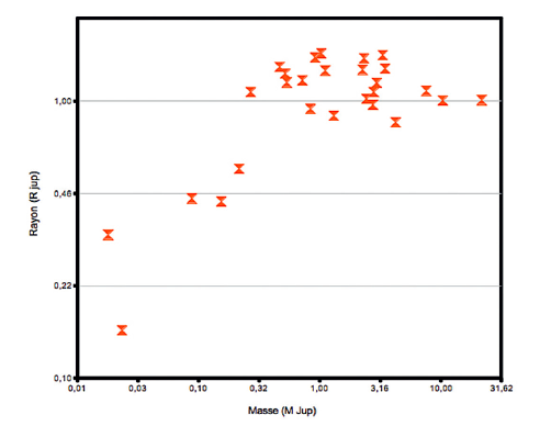 Les planètes de CoRoT couvrent la très large gamme de propriétés et de caractéristiques qu’on retrouve dans la famille disparate des exoplanètes : ainsi la masse des planètes CoRoT décrit un domaine très large de plus de trois ordres de grandeur en masse, 10 en rayon et 100 en densité moyenne., comme l’illustre la figure ci contre.