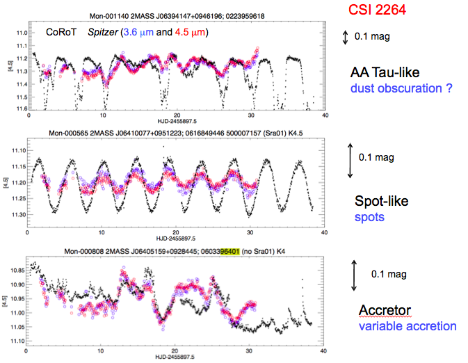 Si dans certains cas (spot-like) les variations dans le domaine infra-rouge (Spitzer) suivent celles du domaine optique (CoRoT) ce n’est pas le cas pour les objets dominés par l’absorption de la poussière dans le disque ou plus encore dans des objets de comportement très erratique.