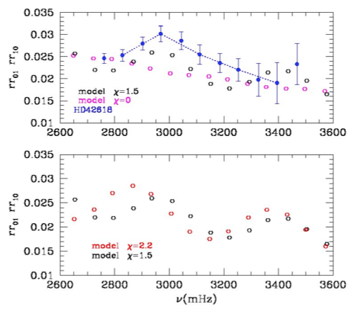 En haut, bleu les donnée d’observation , les cercles les prédictions résultats de deux modèles, l’un avec pénétration convective (noir) ou sans (magenta, en bas deux modèles avec des profondeurs de pénétration différentes , indiquant la sensibilité de cet indicateur à l’extension de la zone.© Barban, A and A in press