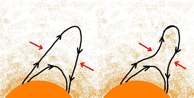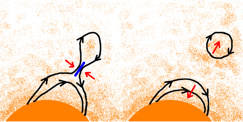 Dans la Figure 1 sont montrées deux lignes de champ magnétique sortant de l’intérieur du Soleil et s’étalant dans la couronne. Toute ligne de champ magnétique devant obligatoirement se refermer sur elle-même, les deux lignes doivent nécessairement replonger dans le Soleil pour fermer leur boucle respective. La couronne étant un milieu très dynamique, il est permis d’imaginer que le plasma au voisinage de nos deux boucles magnétiques est en mouvement suivant les flèches rouges de la Figure 1. La couronne étant un conducteur formidablement efficace, nous pouvons supposer que la MHD idéale s’applique, et que les lignes de champ magnétique sont gelées dans le plasma. Sans être obligés d’en passer par des calculs compliqués, nous savons donc que les lignes de champ magnétique doivent suivre les mouvements du plasma.