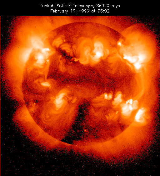 Nous savons bien identifier les grandes éruptions, qui constituent une montée nette des émissions X, radio etc. Mais quelle est la limite inférieure à l’intensité d’une éruption ? On ne sait pas si une telle limite existe. Il se pose alors la question de savoir si le chauffage de la couronne, qui porte ce plasma à plus d’un million de degrés et le rend visible en rayons X mous (voir Figure 6 ) n’est pas au moins en partie le résultat de libérations explosives d’énergie, à plus faible budget d’énergie qu’une grosse éruption, mais procédant d’une façon quasi-continue dans les régions actives.