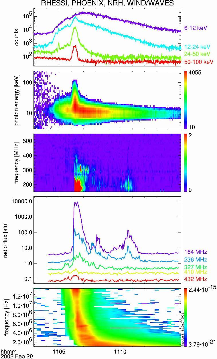 1er et 2e cadres en partant du haut : rayonnement X (RHESSI, NASA) – l’émission est de plus en plus brève (p. ex. la courbe rouge) au fur et à mesure que l’énergie des photons (leur fréquence) augmente. C’est le rayonnement X « dur » qu’émettent des électrons énergétiques lorsqu’ils entrent en collision avec les atomes dans la chromosphère.