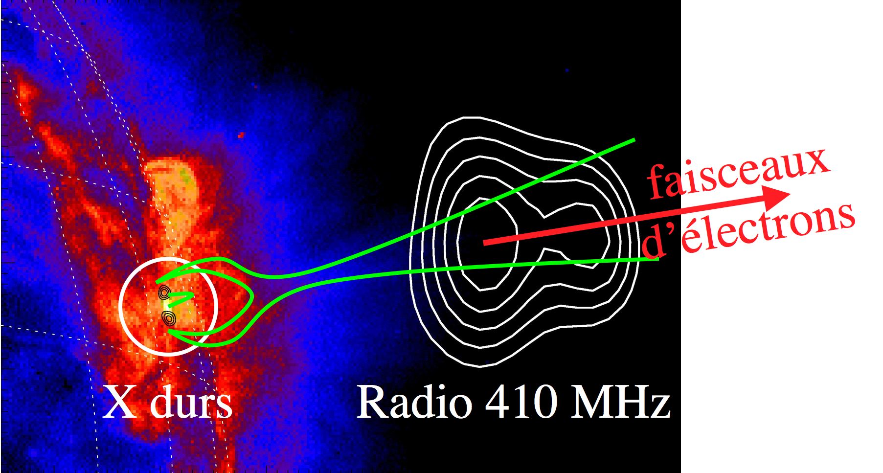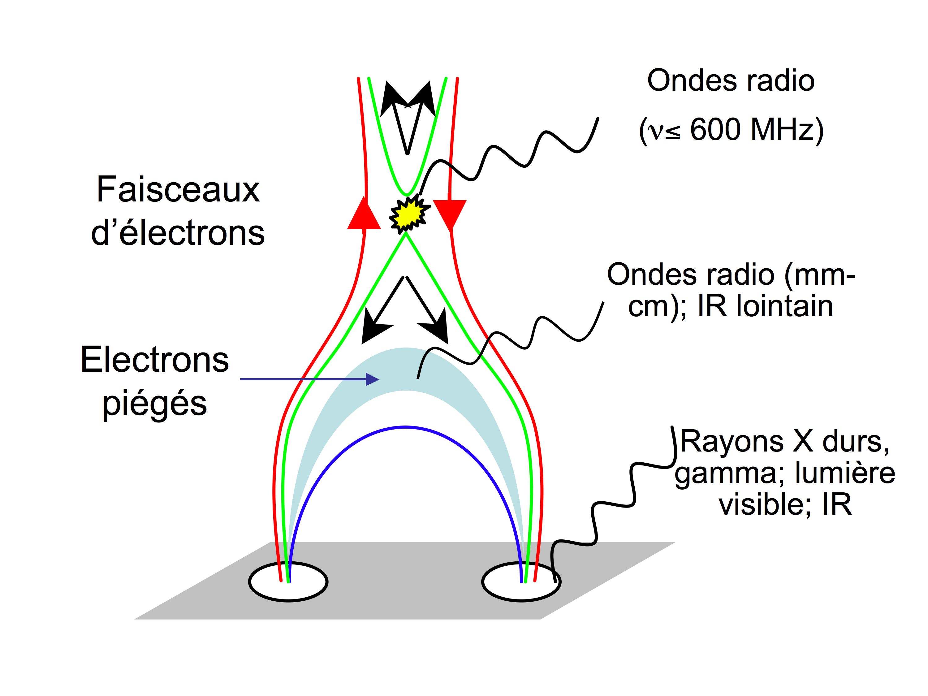 L’imagerie X et radio suggère que les faisceaux d’électrons partent en directions opposées, vers la chromosphère et vers la haute couronne, depuis un site commun d’accélération qui se situe dans une région de reconnexion magnétique.