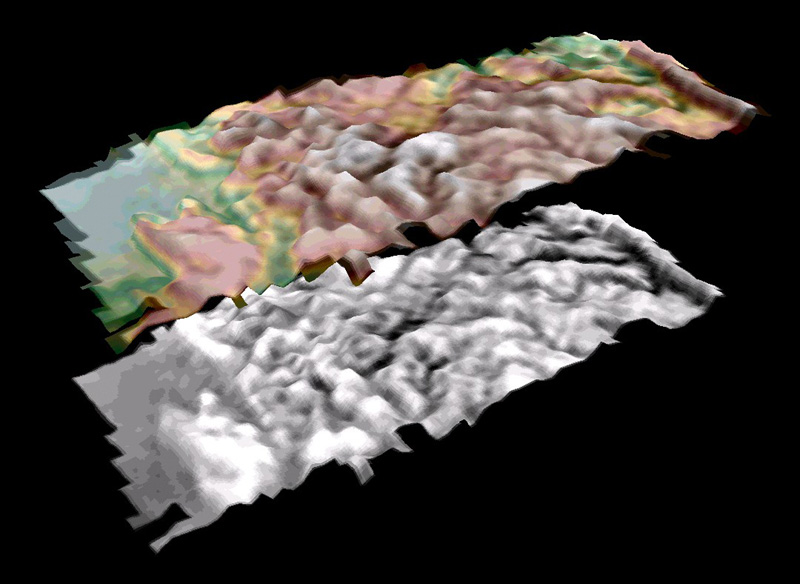 Vue en perspective du haut plateau situé 5 km au nord du site d’atterrissage. Le modèle en gris et en fausses couleurs indique l’altitude (en plus clair l’altitude la plus élevée). La région, qui couvre approximativement 1x3 km, comprend le réseau de chenaux ramifiés sur le haut plateau et une portion du lac asséché (en bleu) au sud de la ligne côtière. L’analyse stéréographique indique que les chenaux ont une largeur de 100-200 m et une profondeur de 50-100 m avec des pentes atteignant par endroits 30°, proche de l’angle d’éboulement. Des écoulements rapides dans les lits de rivières ont probablement créé ces vallées profondément incisées, avec une érosion due à des glissements de terrain abrupts sur leurs pentes.
