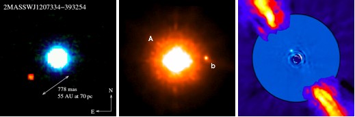 De gauche à droite : 2M1207b (5 MJ, 46 UA, Chauvin et al. 2005), Gl86 b (17 MJ, 100 UA, Neuhaüser et al. 2006), β Pictoris b (8 MJ, 8 UA, Lagrange et al. 2008). Note : MJ = masse de Jupiter, UA = Unité Astronomique.