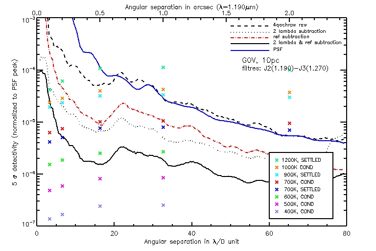 Les courbes correspondent aux diffĂ©rents niveaux de traitement dĂ©crit prĂ©cĂ©demment (paragraphe CaractĂ©ristiques Instrumentales). Les croix de couleurs correspondent Ă diffĂ©rentes tempĂ©ratures de planètes. Les croix situĂ©es au dessus d’une ligne sont dĂ©tectables.