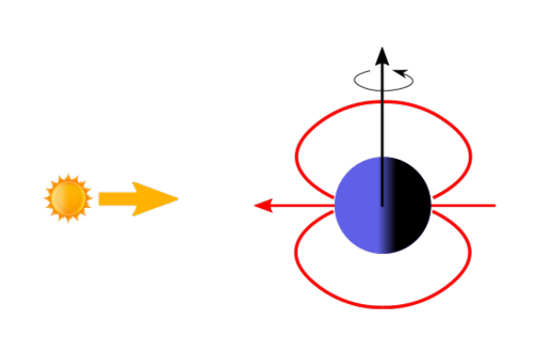 Le vent solaire vient de la gauche et souffle perpendiculairement à l’axe de rotation de la planète. Au cours d’une journée, l’angle entre l’axe magnétique (en rouge) et la direction du vent solaire parcourt tous les angles de 0° à 360° (extrait et adapté de Griton & Pantellini 2020).