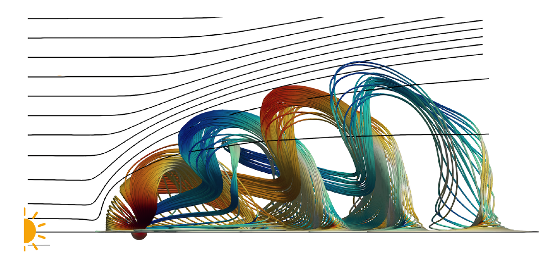 Les lignes bleues et rouges sont connectées aux pôles magnétiques opposés de la planète. Elles sont enroulées par la rotation planétaire. En noir les lignes d’écoulement du plasma du vent solaire. L’effet du vent est de replier les lignes de champ magnétique dans la direction opposée au Soleil (extrait et adapté de Griton & Pantellini 2020).
