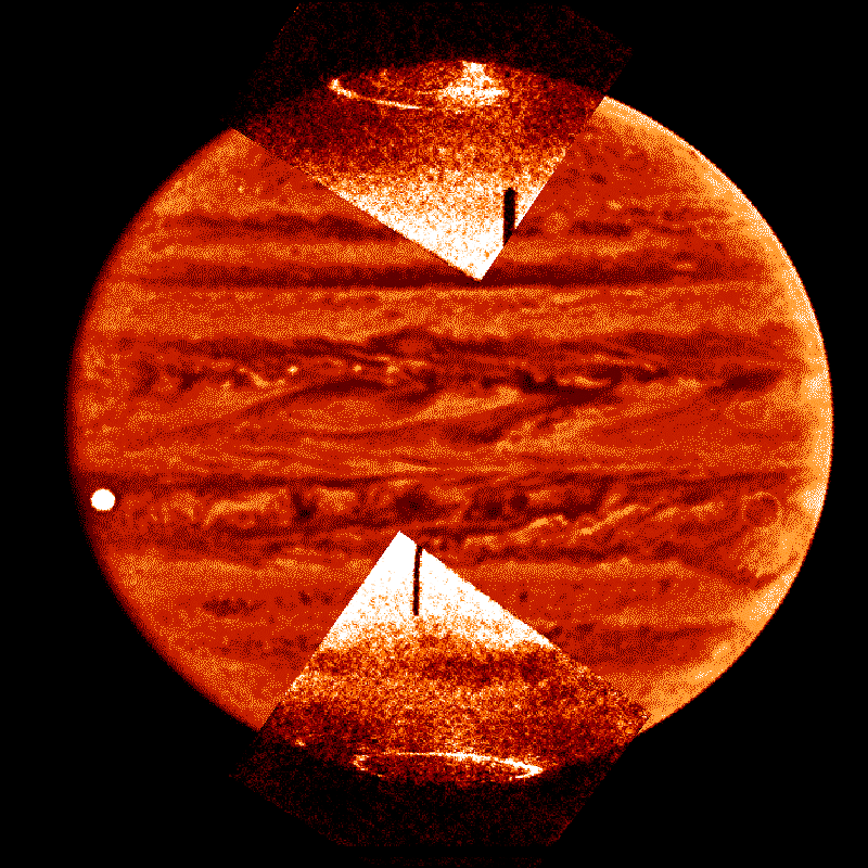 L’image du disque de Jupiter qui complète la mosaïque a été réalisé en lumière visible par l’un des télescopes du VLT de l’Observatoire Européen Austral. Les deux barres noires verticales représentent les ombres du doigt coronographique de la caméra. Le disque blanc près du bord gauche de Jupiter est le satellite Io de passage devant la planète (Laurent Pallier et Renée Prangé).