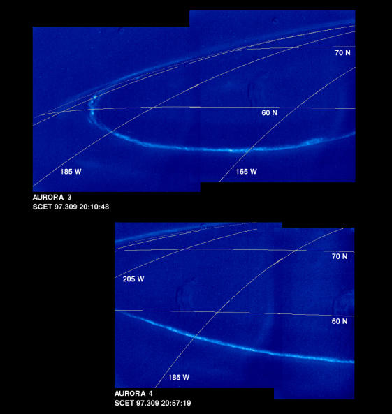 Les lignes de champ magnétique qui balayent les atmosphères très ténues et conductrices des satellites galiléens, Io, Europe, Ganymède, donnent lieu à des courants alignés qui permettent la précipitation de particules chargées dans la haute atmosphère de Jupiter. On peut alors observer les émissions situées au pied de ces lignes de champ sur la planète dans les deux hémisphères de Jupiter (voir la mosaïque des deux images UV en fausses couleurs réalisées par le télescope saptial Hubble ).