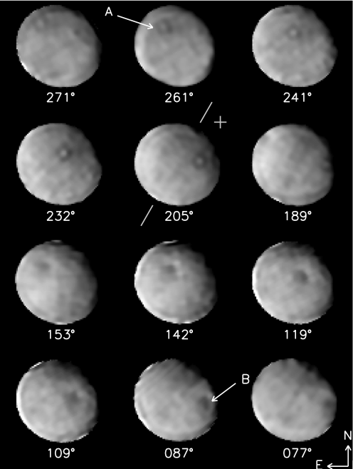 Des images résolues acquises depuis le sol ont permis de dériver des cartes de ces trois objets. Cérès possède des zones sombres, bien qu’il s’agisse d’un des corps les plus uniformes du Système solaire, confirmant la première cartographie effectuée par HST en ultraviolet (Carry et al. 2008, Erard et al. 2005, Perna et al. 2015). La série d’images ci-contre permet de suivre plusieurs taches sombres au cours d’une rotation. Depuis 2015, la cartographie à haute résolution de Cérès a été complétée en orbite (mission Dawn de la NASA), et a confirmé ces premiers aperçus. Des observations Herschel avaient également permis d’observer des sources de vapeur d’eau en surface (Küppers et al. 2014).