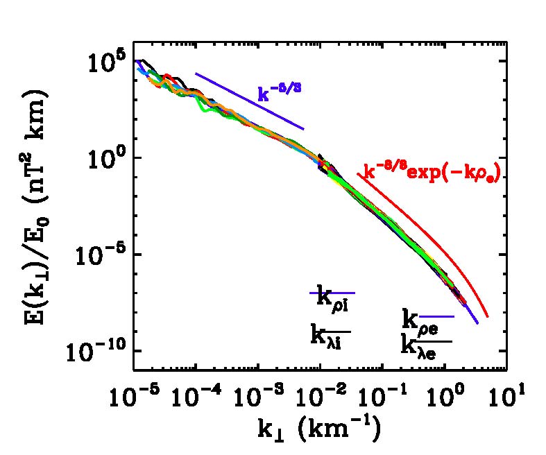 L’énergie spectral en fonction de vecteur d’ondes perpendiculaire au champ magnétique ambiant suit une loi de Kolmogorov k-5/3 dans le domaine MHD (k<kRi et kLi, avec kRi = 1/Ri, Ri étant le rayon de Larmor des ions et Li étant l’échelle d’inertie des ions), puis on observe un changement d’allure sur les échelles ioniques et un autre spectre générale dans le domaine cinétique k-8/3exp(-kRe) avec la fin de cascade sur les échelles électronique indiqué par la courbure du spectre sur ces échelles.