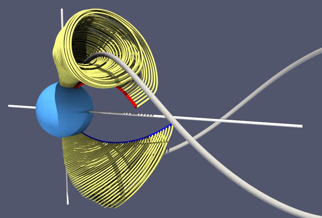 En jaune, surface en forme de vortex montrant le mouvement dans le temps des points qui composent deux lignes magnétiques tronquées (l’une rouge, l’autre bleue). Le mouvement conduit inexorablement les deux lignes vers le centre des deux vortex représenté par les deux lignes grises formant une double hélice. Les deux pieds de la double hélice indiquent les deux pôles magnétiques à la surface de la planète.