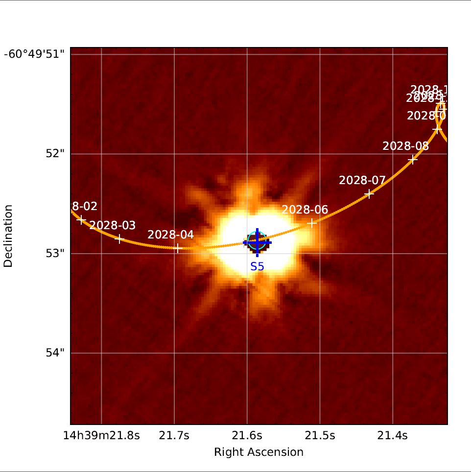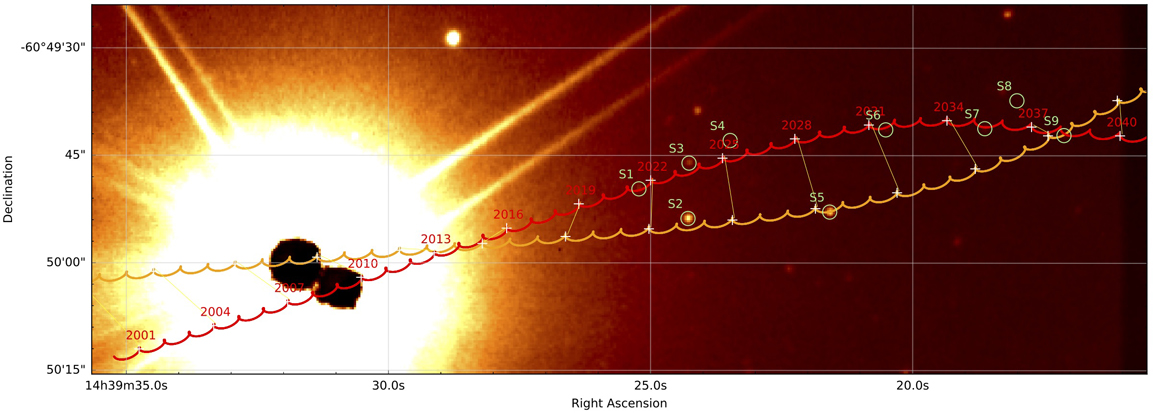 Utilisant des observations de plusieurs instruments, nous avons dĂ©terminĂ© la trajectoire apparente de Alpha Centauri A et B sur le fond stellaire. Une conjonction remarquable de l’Ă©toile A avec une Ă©toile plus Ă©loignĂ©e (S5) se produira en 2028, Ă une sĂ©paration de seulement 15 millièmes de seconde d’angle (soit l’Ă©quivalent de la taille apparente d’une pièce d’un euro observĂ©e Ă 300 km de distance).