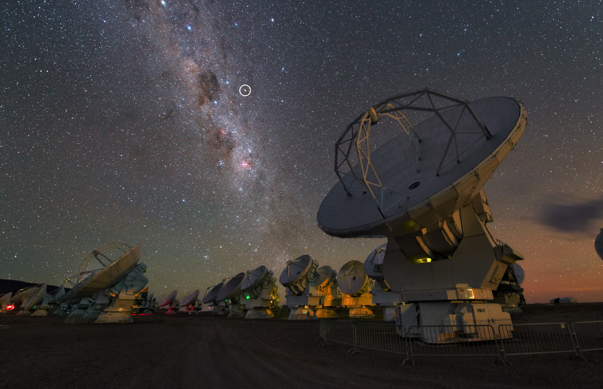 ALMA est constitué de 66 antennes individuelles utilisées conjointement, et qui peuvent être séparées jusqu’à 16 km pour synthétiser la résolution angulaire qu’aurait un télescope de cette taille. Bételgeuse est visible sur l’image comme une étoile orangée près du centre de l’image (cercle blanc).
