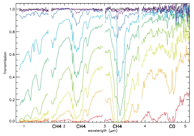 Sur Titan, VIMS permet d’étudier le cycle mĂ©tĂ©orologique du mĂ©thane et de l’éthane avec l’observation, Ă latitude moyenne, de nuages convectifs de mĂ©thane qui Ă©voluent et se dissipent en quelques heures et, au-delĂ de 50°N, d’un vaste nuage d’éthane dans la troposphère. La dĂ©tection d’émission thermique de CO Ă 5 µm a permis une mesure de son abondance stratosphĂ©rique. Une occultation solaire dans l’hĂ©misphère sud a fourni le profil vertical d’extinction des aĂ©rosols de 1 Ă 5 µm, avec notamment une absorption Ă 3,4 µm due Ă des composĂ©s organiques complexes (thèse d’A. Bellucci). Des rĂ©sultats marquants ont aussi Ă©tĂ© obtenus sur la surface de Titan et des autres satellites de Saturne :
